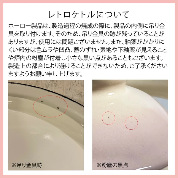 ホーローを焼く時に吊るすため吊るした跡が残る、また焼く際に細かな黒い点がつく場合が